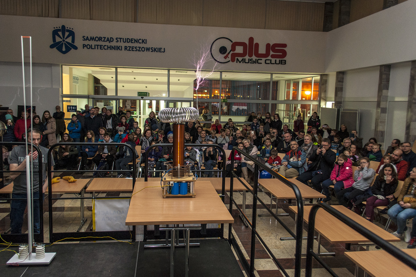 Popularną atrakcją Nocnych Spotkań z Nauką był także „teatr wysokich napięć”, wydarzenie zorganizowane przez firmę Polimedia, partnera Dni Otwartych Politechniki Rzeszowskiej, która współpracuje z uczelnią w ramach Politechniki Dziecięcej. Firma Polimedia przygotowała m.in. spektakl z wykorzystaniem jednych z największych w swoich klasach transformatorów Tesli. Współorganizatorem wydarzenia było Studenckie Koło Naukowe Elektryków „MegaVolt”. Zaprezentowane zostały urządzenia wykonane przez członków koła – generator Van der Graafa, lampowa cewka tesli (VTTC) oraz zademonstrowano wyładowania pod obniżonym ciśnieniem. Wszystkie zawiłości obserwowanych zjawisk i urządzeń wyjaśniał opiekun koła – mgr inż. Sebastian Hajder.