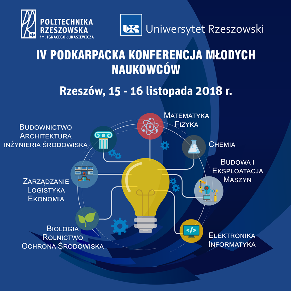 W dniach 15-16.11.2018 r. na terenie Politechniki Rzeszowskiej odbędzie się kolejna, już czwarta edycja Podkarpackiej Konferencji Młodych Naukowców. Konferencja jest skierowana do studentów, doktorantów oraz młodych doktorów z całej Polski. Jej celem jest integracja przedstawicieli młodego pokolenia naukowców z różnych środowisk naukowych oraz wskazanie studentom możliwości dalszego rozwoju w pracy naukowej.